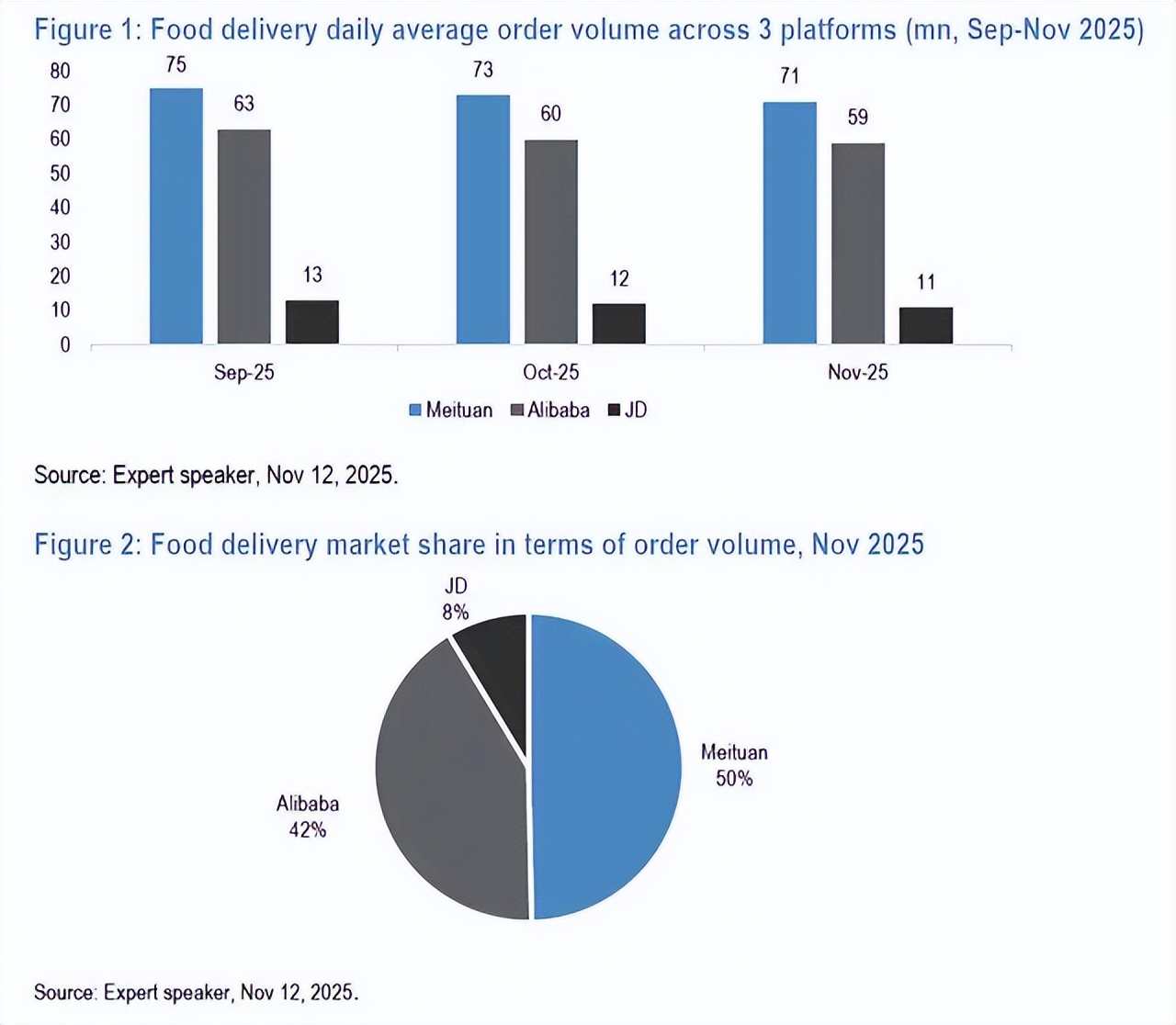 摩根大通11月调研数据显示,从订单量看,美团的份额分别为50%,其他两家分别为42%和8%。以GTV计算,美团的份额稳定保持60%以上。