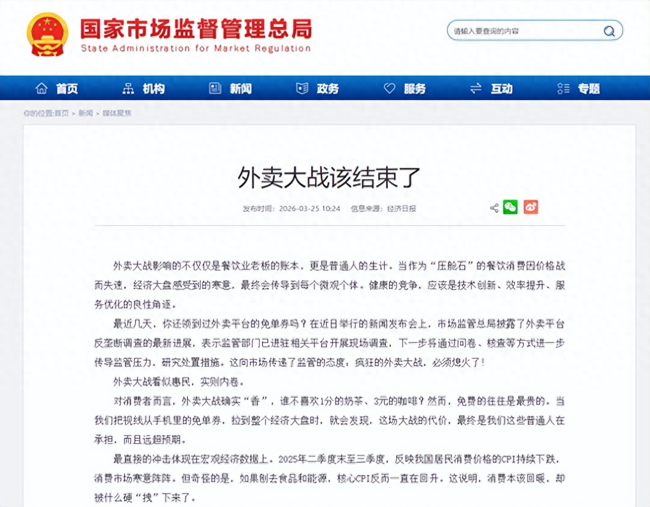 于是,一个最为恰当的时机,监管总局转发经济日报文章定调:外卖大战该结束了。