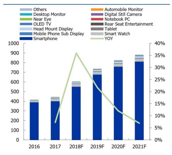 据Omdia报告,今年智能手机中使用的AMOLED面板出货量将从2019年的4.71亿片激增至5.13亿片,在如此巨大的市场需求之下,柔宇科技能分到一杯羹么?