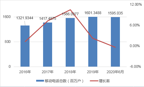 从行业上来说,手机行业的增长几乎已经见顶了。根据工业和信息化部的数据显示,回顾2015年到2020年这五年间,移动电话的增长率一直在十位数以下。截止到2020年6月,中国的移动电话用户数为15.95亿,按照14亿人口来计算,人均已经超过1个电话了。截止到2019年12月,移动电话用户数为16.01亿,2020年上半年还有小幅下降。
