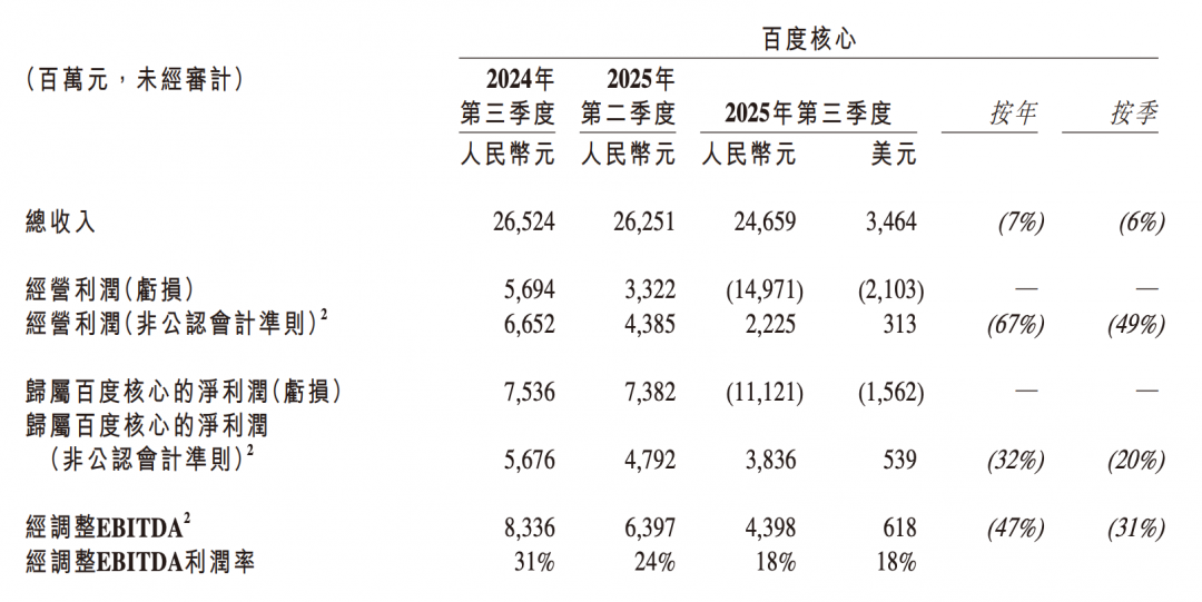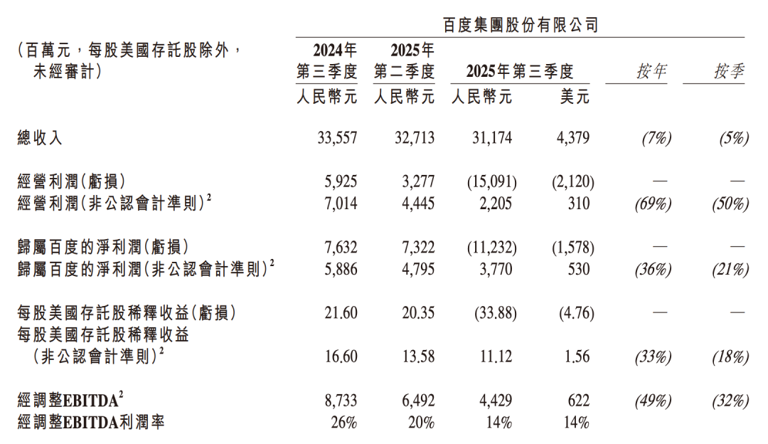 【TechWeb】11月18日消息,百度发布2025年第三季度财报,总营收为人民币312亿元(约43.8亿美元),同比下降7%,环比下降5%。受长期资产减值人民币162亿元(约22.7亿美元)影响,公司出现经营亏损人民币151亿元(约21.2亿美元),净亏损人民币112亿元(约15.8亿美元)。若剔除该减值影响,非公认会计准则下经营利润为人民币22亿元(约3.1亿美元),净利润为人民币38亿元(约5.3亿美元),核心业务仍保持盈利能力。