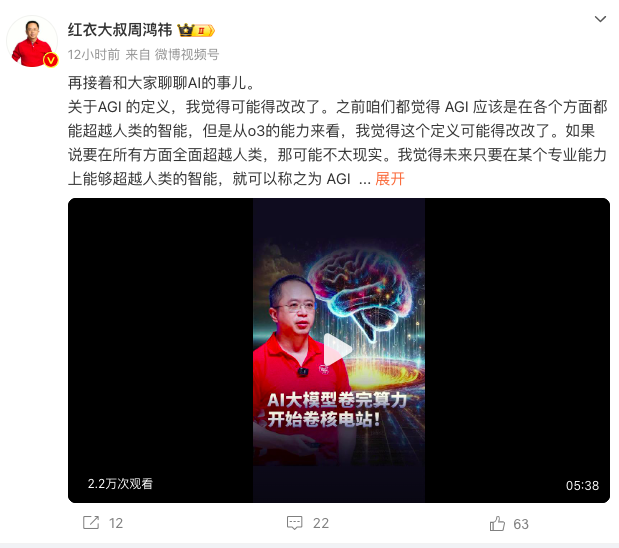 周鸿祎称:“我一直对AGI的提法有点困惑,我觉得如果把AGI定义成在各方面的能力上都全面的超越人类,就是通用人工智能,那么可能今天o3离AGI还依然差得很远。”