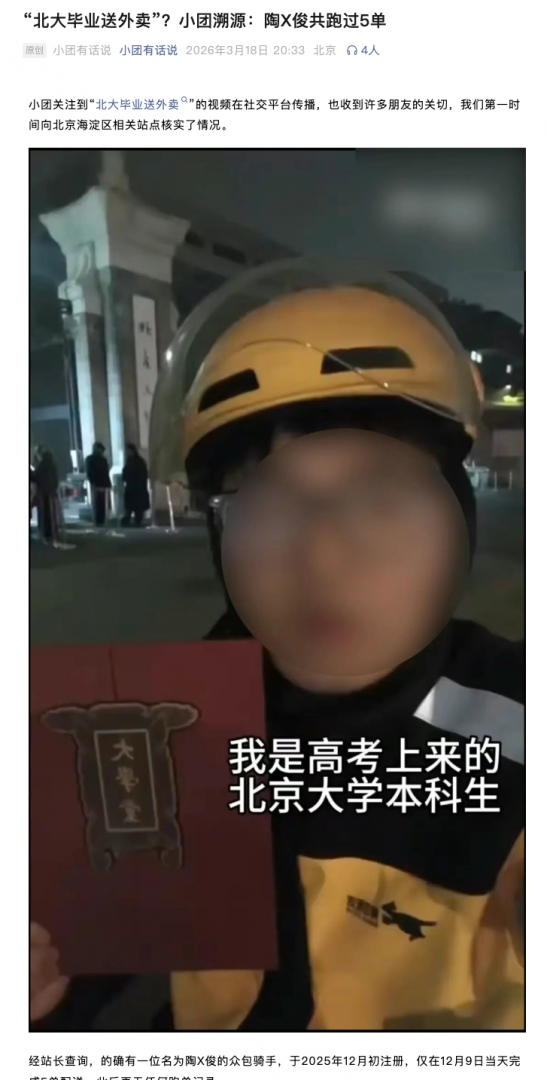 美团回应“北大毕业送外卖”快讯
