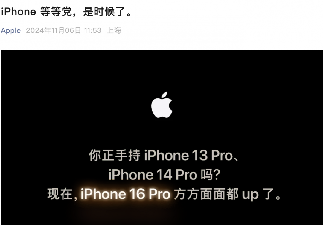 苹果表示,iPhone 16 Pro方方面面都up了,iPhone 13 Pro、iPhone 14 Pro用户是时候升级了。