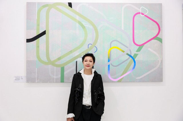 首先是艺术家周力的作品《叠奏曲》,是本次艺术共创作品中最值得珍藏的一副作品。周力教授毕业于中国广州美术学院油画系,2012年至今受聘为广州美术学院客座教授,2019年至今任广州美学学院油画系第五工作室主任、坪山美术馆学术委员,拥有独到的艺术理解。本次创作,周力教授通过“布面综合材质”以及“8个银色、7个不同色系,共十五个风向标”,把自然界的协调与共生,融入这些色彩所传达的现代气质和都市基调中。