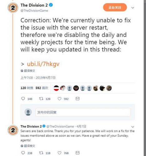 而《全境封锁2》的育碧官方社区中关于维护的公告看起来更加的逗人,因此我们从现在起禁用了游戏中的日常以及周常任务,修复日常以及周常任务Bug。