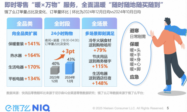 报告显示,12月以来,饿了么上热水器、保暖套装外卖量日均环比(10月)分别增长164%和141%,夜间凌晨订单占比较往年增长3个百分点,送往酒店、商务楼等多场景的订单环比也均较为显著。在冬暖需求驱动下,提供全品类、全时段和全场景服务的饿了么等即时零售平台成为了激活冬季消费的重要引擎,也为更多品类发展带来新的机遇。