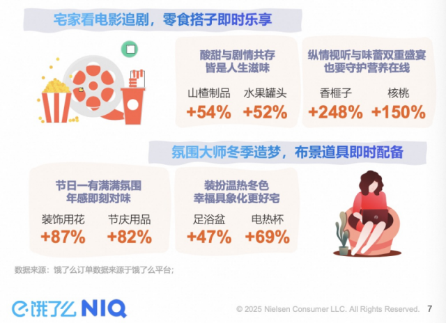 依赖即时零售一键下单直送,冬天宅家的幸福感不降反增。不论是一天五餐的日常暖胃,还是团聚、节日欢庆场景,均直接带动热饮、酒水、零食等外卖订单环比增长。报告显示,12月以来,饿了么上冲饮奶茶、松露巧克力、核桃等外卖量均环比增长超过100%,火锅饺等食材、红葡萄酒、足浴盆等宅家氛围好物外卖量也均环比增长超过40%。