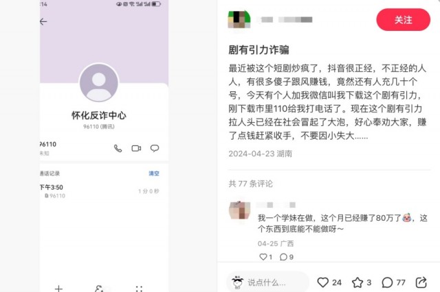 在社交平台,也有一些网友发出了疑问。一位网友在小红书发帖称,“有个人加我微信叫我下载这个剧有引力,刚下载市里110给我打电话了。”并晒出了怀化反诈中心的来电显示截图。