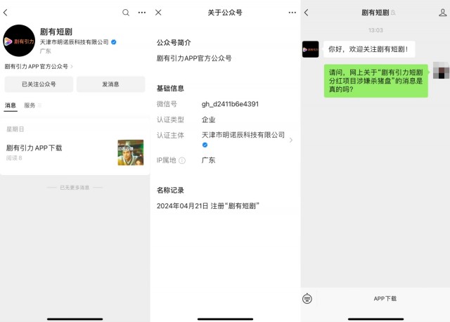 小编找到了剧有引力APP的官方公众号,在留言中询问关于“剧有引力短剧分红项目涉嫌杀猪盘”的消息是否属实,截至发稿,对方暂未回应。