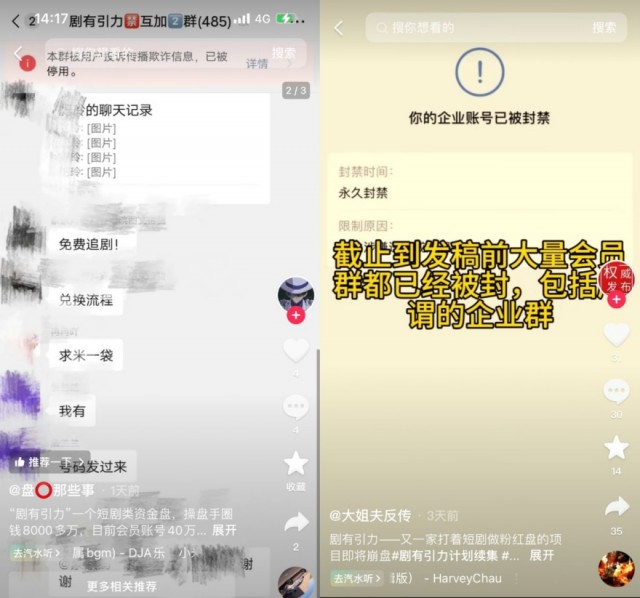 据“昊天评盘界”等多个公号爆料,目前“剧有引力”多个微信会员群被封,被封页面显示,“本群被用户投诉传播欺诈信息,已被停用。”该项目背后公司的企业微信也被曝已经被封,原因为“企业使用企业微信过程中涉嫌违法或违规”。