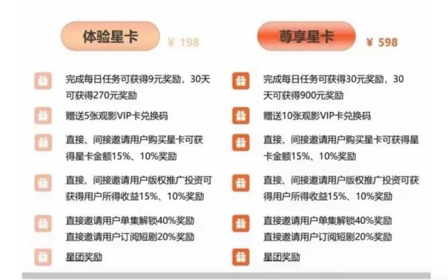 这两种模型都有直推、间推奖励。其中,直接、间接邀请用户购买星卡可获得星卡金额15%、10%奖励;直接、间接邀请用户版权推广投资可获得用户所得权益15%、10%奖励。也就是说,直推一个新用户购买598元档位的星卡,可以拿到89.7元奖励。