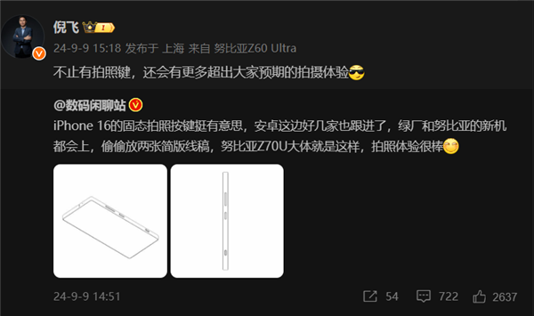 据知名数码博主@数码闲聊站 最新发布的信息显示,iPhone 16上的固态拍照按键挺有意思,目前安卓这边已经有好几家厂商在跟进,除了此前已经得到不少曝光的全新OPPO Find X8系列外,努比亚这边的新机也会上,这也得到了努比亚总裁倪飞的确认。同时从该博主晒出的努比亚Z70 Ultra的简版线稿来看,该机总体上仍将延续努比亚Z系列经典的方正机身设计,并将电源键与音量调节键置于机身右侧,拍照按键则位于音量按键与电源键的下方。值得注意的是,这并不是努比亚学习苹果,要知道早在努比亚Z50 Ultra上就已经开始集成了侧边拍照按键,不仅能够快捷调用相机,还可自定义按键的功能,比如录音、手电筒、快捷开启应用等。