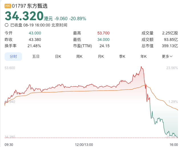 东方甄选股价上演1小时过山车