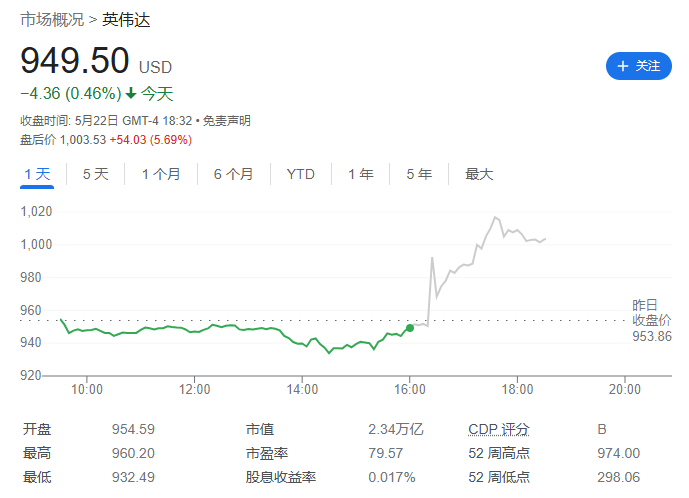 当日,英伟达股价在纳斯达克常规交易中收盘下跌 4.36 美元,报 949.50 美元,跌幅为 0.46%。在随后截至美国东部时间 22 日下午 5 点 43 分(北京时间 23 日凌晨 5 点 43 分)的盘后交易中,英伟达股价大幅上涨 59.27 美元,至 1008.77 美元,涨幅为 6.24%,突破 52 周最高价。在截至美股市场 22 日收盘为止的过去 52 周,英伟达的最高价为 974.00 美元,最低价为 298.06 美元。(王许宁)