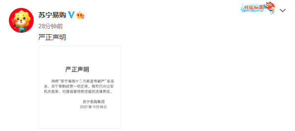 苏宁易购回应破产传闻:系谣言 经营一切正常快讯
