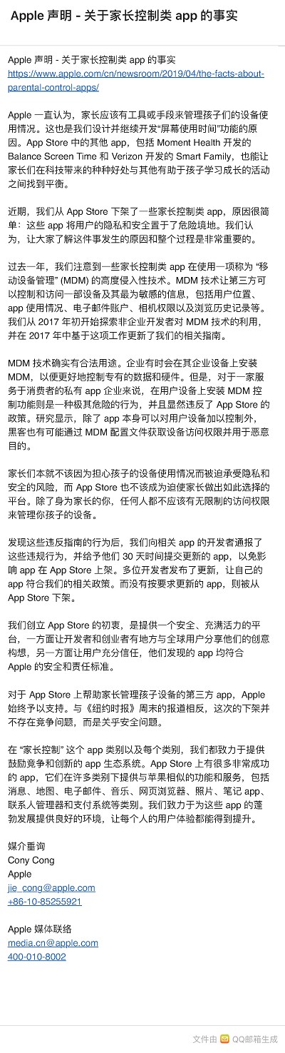 苹果公司高级副总裁菲尔-席勒已经用邮件对用户进行了回复,阐述了下架这些App的原因。另外,苹果还在官网发布了一则题为《The facts about parental control apps(关于家长控制类App的事实)》的声明,现在已有用户收到了苹果官方发来的中文翻译版声明,其全文如下。