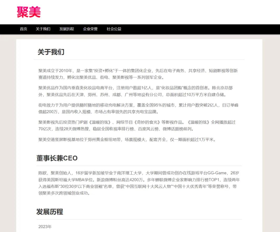在尝试访问聚美优品官网时,锌财经发现网站已不再展示任何商品或购物信息,页面仅保留了公司介绍、发展历程等基本信息。