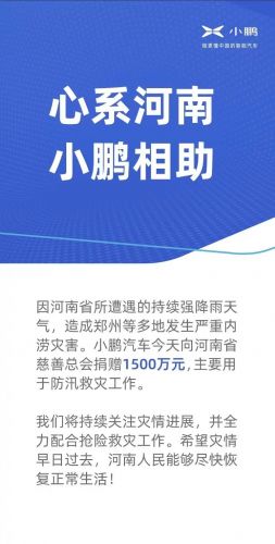 @小鹏汽车:捐1500万,并全力配合抢险救灾工作