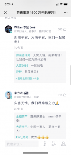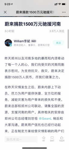 @蔚来汽车:捐1500万,调集全国的资源,支援河南的用户