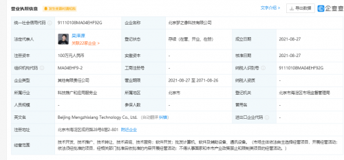 【TechWeb】企查查APP显示,近日,北京梦之像科技有限公司成立,法定代表人吴泽源,注册资本100万元人民币,经营范围包括技术开发、技术推广、技术转让、技术咨询、技术服务;软件开发;批发计算机、软件及辅助设备、通讯设备。