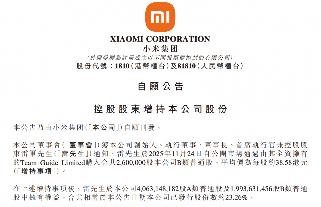 【TechWeb】11月25日消息,小米集团在港交所发布公告称,公司董事会获公司创始人、执行董事、董事长、首席执行官兼控股股东雷军通知,雷军与2025年11月24日自公开市场通过由其全资拥有的Team Guide Limited购入合共260万股公司B类普通股,平均价为每股约38.58港元。