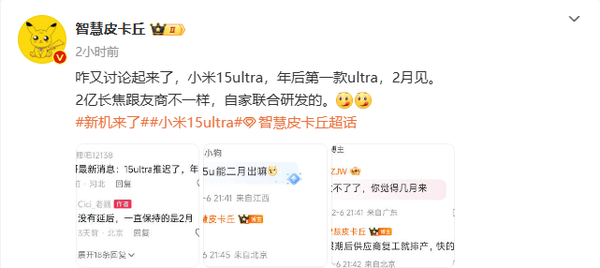 据知名数码博主@智慧皮卡丘 最新发布的信息显示,与此前曝光的消息基本一致,全新的小米15 Ultra将是年后第一款Ultra旗舰,将在2月正式亮相,其最大的卖点就是将搭载一颗2亿像素的潜望式长焦镜头。不过该博主表示,该机的这颗2亿像素长焦镜头跟友商的不一样,并没有像此前爆料的那样,采用vivo X100 Ultra等影像旗舰所搭载的三星HP9传感器,而是将使用自家联合研发的全新CMOS,但目前暂未公布这颗新CMOS的具体参数。