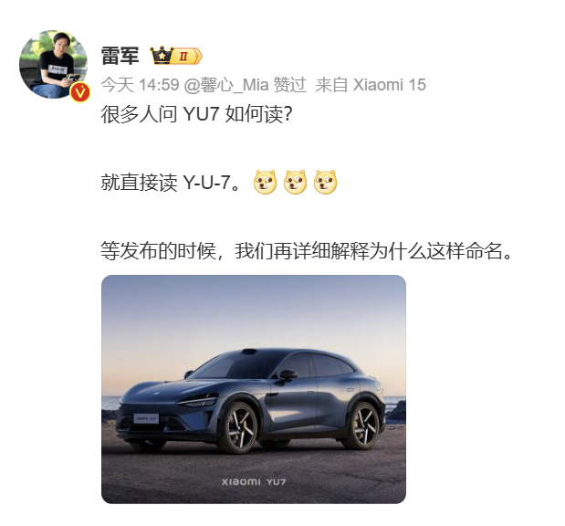 针对这一热议,小米CEO雷军通过微博发文回应了YU7的正确读法:“很多人问YU7如何读?就直接读Y-U-7[doge][doge][doge]。”雷军表示,在发布时会详细解释为什么选择这样的命名方式。