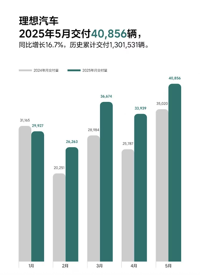 6月1日消息,今日,理想汽车公布2025年5月交付数据。2025年5月,理想汽车交付新车40856辆,同比增长16.7%。截至2025年5月31日,理想汽车历史累计交付量为1301531辆。