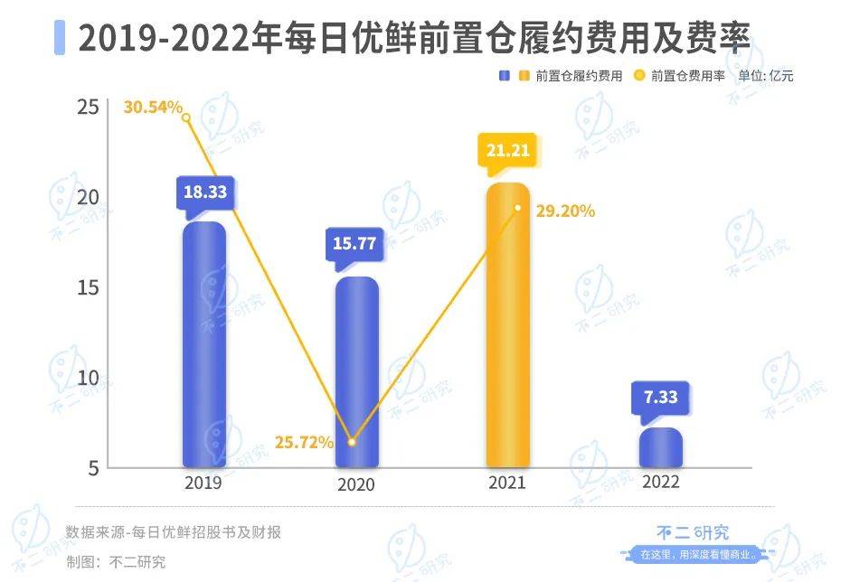 在「不二研究」看来,高企的前置仓履约费用,或是每日优鲜盈利“造血”的最大难点。 2019-2021年,其前置仓履约费用分别为18.33亿元、15.77亿元、21.21亿元。 对比同期的净收入粗略计算,其履约费用率从2019年的30.54%,逐步降低2020年的25.72%,在2021年回升至29.20%。