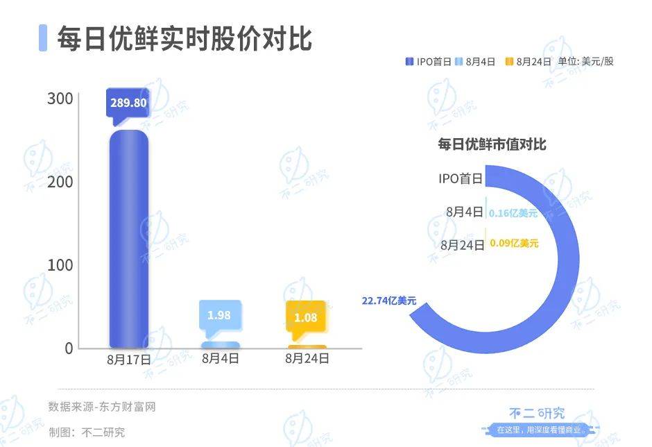 截至美东时间8月24日美股收盘,每日优鲜报收1.08美元/股,对应市值879.4亿美元(约折合人民币640.80亿元);对比IPO市值22.74亿美元,其市值已经蒸发99%。