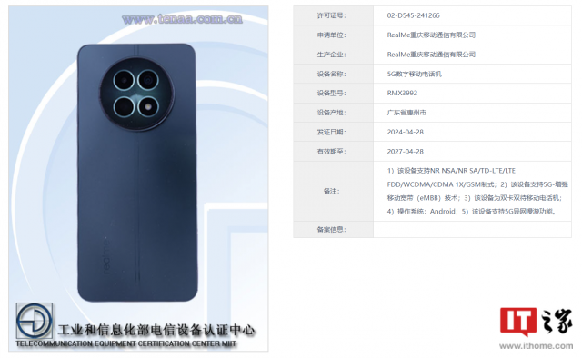 IT之家 5 月 4 日消息,日前,一款型号为 RMX3992 的 realme 新机在工信部入网并公布证件照,外观与在印度发布真我 12 标准版基本一致,预计为对应的国行版本。