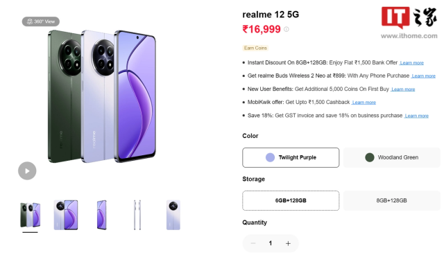 作为参考,目前在售的印度版真我 12 手机 6GB+128GB 版售价 16999 卢比(IT之家备注:当前约 1476 元人民币),8GB+128GB 版售价 17999 卢比(当前约 1562 元人民币)。