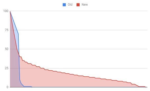 图示:新旧两种方式下从业人员收入对比(蓝色曲线为传统模式,红色曲线为互联网模式)