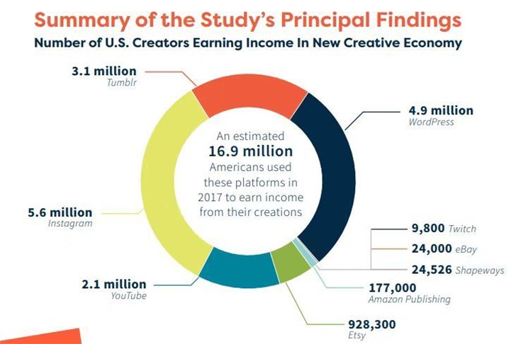 2017年美国共有1690万自媒体通过Instagram、Twitch等各种互联网平台赚取收入68亿美元,而这次研究直接关注了许多小的自媒体,自媒体通过各种平台获得利润。