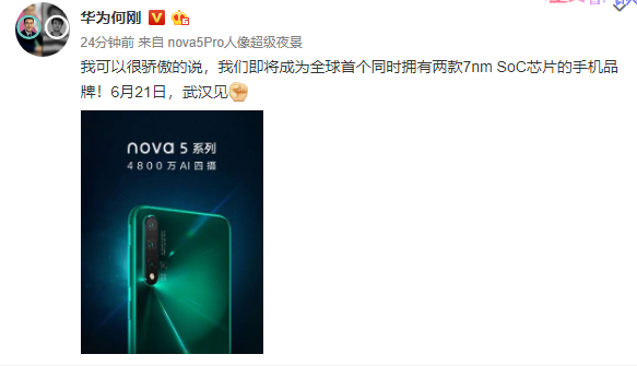 “华为终端手机产品线总裁何今日在微博宣布,华为即将发布全球首个同时拥有两款7nm SoC芯片的手机。”华为终端手机产品线总裁何今日在微博宣布。