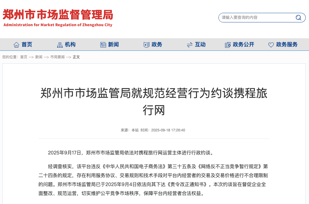 今年9月,郑州市市场监管局依法对携程旅行网运营主体进行行政约谈。经调查核实,携程平台违反《中华人民共和国电子商务法》第三十五条及《网络反不正当竞争暂行规定》第二十四条的规定,存在利用服务协议、交易规则和技术手段对平台内经营者的交易及交易价格进行不合理限制的问题。郑州市市场监管局已于2025年9月4日依法向其下达《责令改正通知书》。