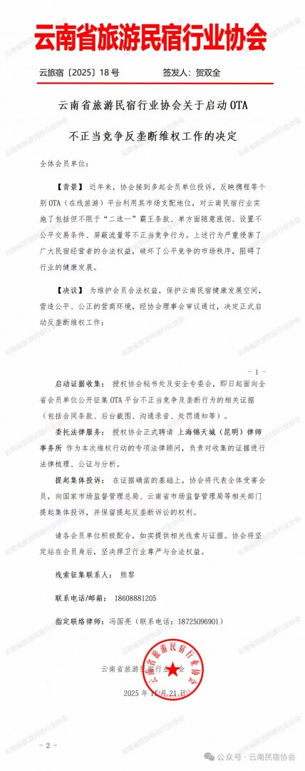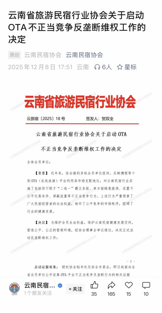云南民宿协会:携程等平台存在不正当竞争,启动反垄断维权工作快讯