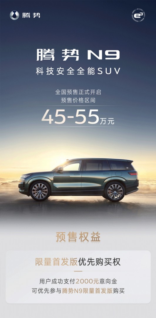 【TechWeb】2月21日消息,腾势汽车旗下全新车型腾势N9今日正式开启预售,预售价45万-55万元。新车定位“科技安全全能SUV”,也是目前腾势品牌的旗舰车型,预计将在3月正式上市。