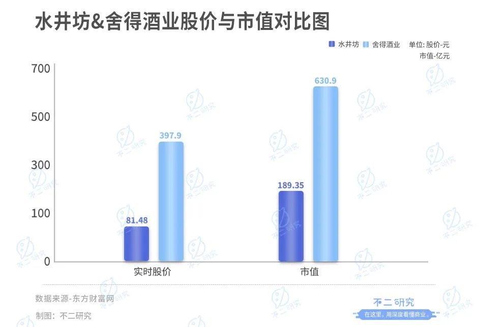 截至2023年2月2日收盘,水井坊报收81.48元/股,对应市值397.9亿元;舍得酒业报收189.35元/股,对应市值630.9亿元。