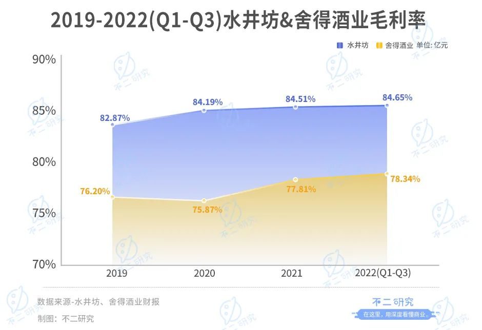 但是「不二研究」发现,从毛利率水平看,水井坊却高于舍得酒业。