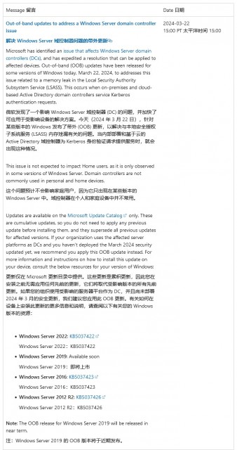 IT之家 3 月 23 日消息,微软今天发布公告,承认 Windows Server 安装 3 月更新后,导致域控制器(DC)崩溃,并于昨日(3 月 22 日)发布紧急补丁(Out-of-band),修复了该问题。