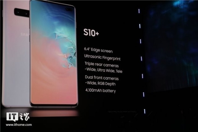 三星S10+搭载了6.4英寸曲面屏,支持超声波屏幕指纹,后置三摄,前置双摄,4100mAh电池。