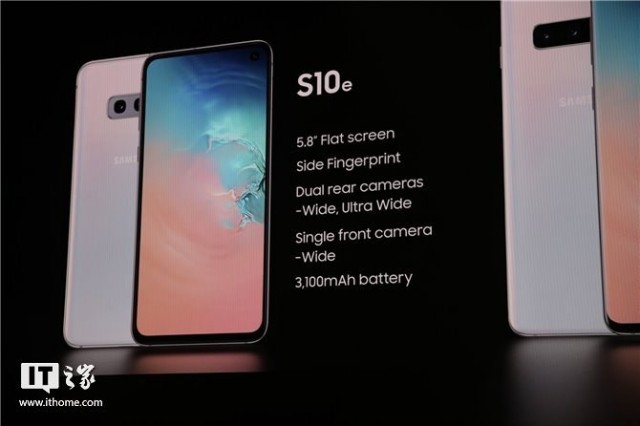 三星S10e屏幕为5.8英寸,非曲面屏,侧边指纹,没有屏幕指纹传感器,只有两个后置摄像头,3100mAh电池。