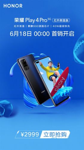 【TechWeb】6月3日,荣耀正式推出了荣耀Play4系列新机,包括Play4、Play4 Pro两个版本,其中后者最大的特色是搭载了麒麟990芯片,并且还额外提供了一款红外测温版本。现在有最新消息,继Play4 Pro标准版上市后,近日荣耀官方发布预告,备受关注的Play4 Pro红外测温版也将于6月18日0点正式首卖,售价2999元(8GB+128GB)。