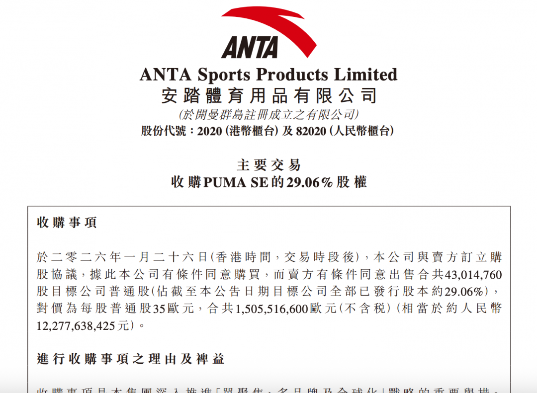 根据公告披露,于2026年1月26日,安踏体育与卖方订立购股协议,据此本公司有条件同意购买,而卖方有条件同意出售合共43014760股目标公司普通股(占截至本公告日期目标公司全部已发行股本约29.06%),对价为每股普通股35欧元,合共15.06亿欧元(不含税)(相当于约人民币122.78亿元)。