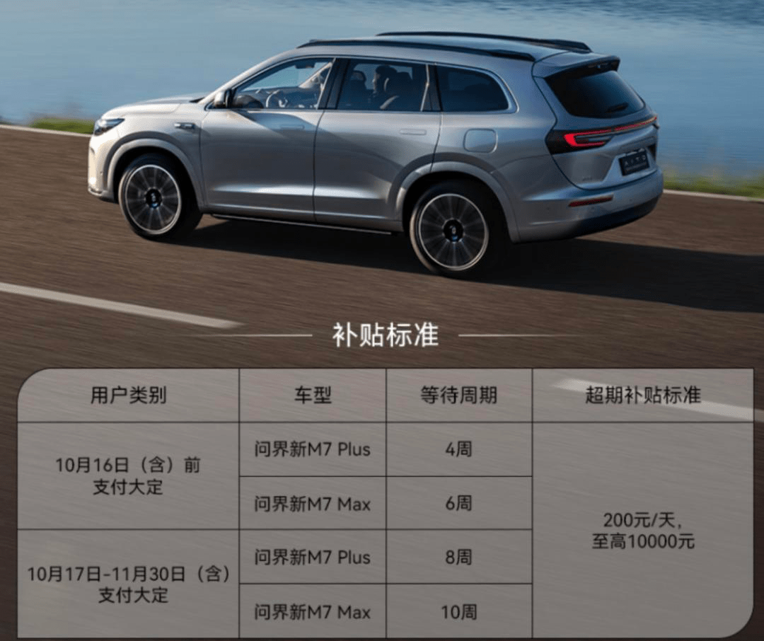 为了稳住用户军心,问界先打了包票,给定最晚交付时间,承诺逾期一天倒赔 200 块,一个月也就是 6K !那脖子哥还巴不得多等几个月呢。