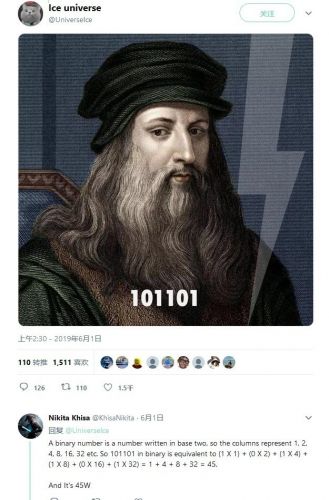 @i冰宇宙 近日在推特晒出了一张达芬奇的图片,而此前也有消息称Galaxy Note10在三星的内部代号就是“达芬奇”。这张图片下方还显示了一组二进制101101的数字,翻译成十进制为数字45。对此有外国网友表示,这应该就是在暗示全新的三星Galaxy Note10将搭载高达45W的快充技术。