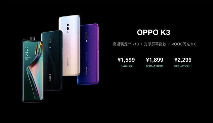 OPPO K3将于6月1日0点再次开售:搭载骁龙710,使用光感屏幕指纹,售价1499元。