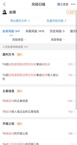 企查查信息显示,赵薇自身风险多达941条,涉及股权冻结、证券虚假陈述责任纠纷、行政处罚信息等。